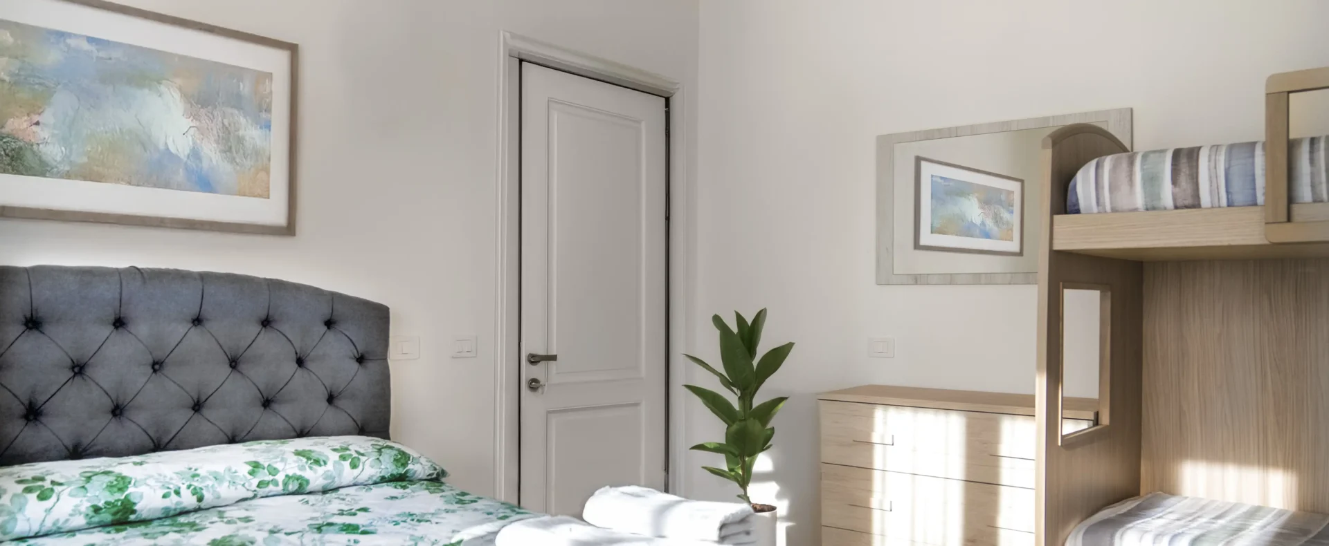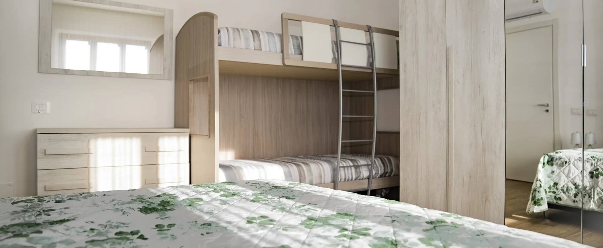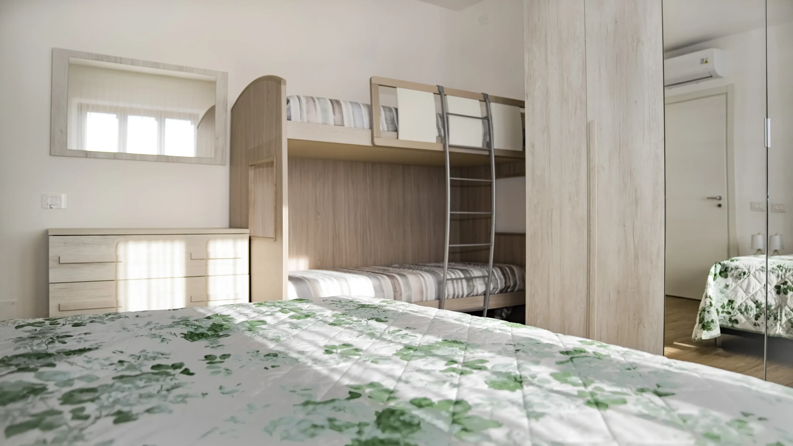 La disposizione interna comprende una cucina attrezzata, un tinello accogliente, un ampio soggiorno una terrazza attrezzata per il pranzo all’aperto, e due camere da letto matrimoniali. La prima camera è dotata di un letto matrimoniale e due letti singoli, perfetta per famiglie numerose. La seconda camera dispone di un comodo letto matrimoniale. Il bagno è moderno e funzionale, con un box doccia spazioso.