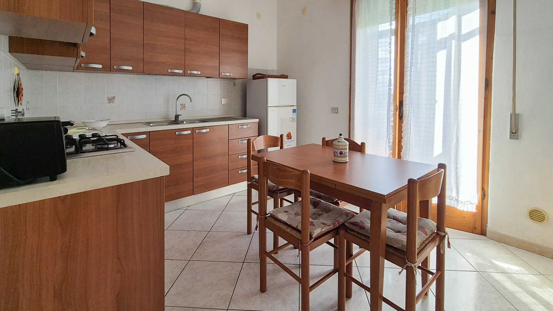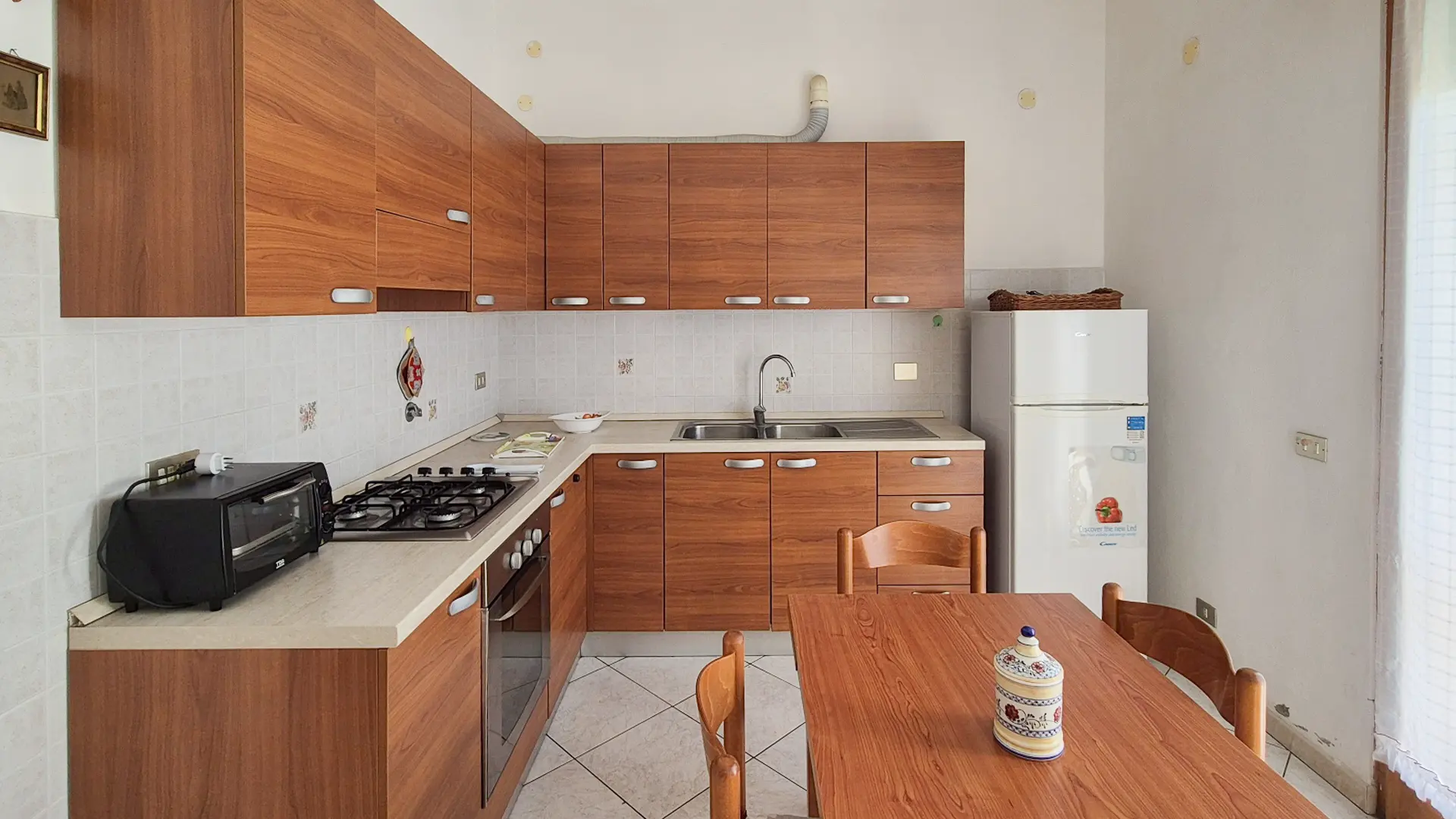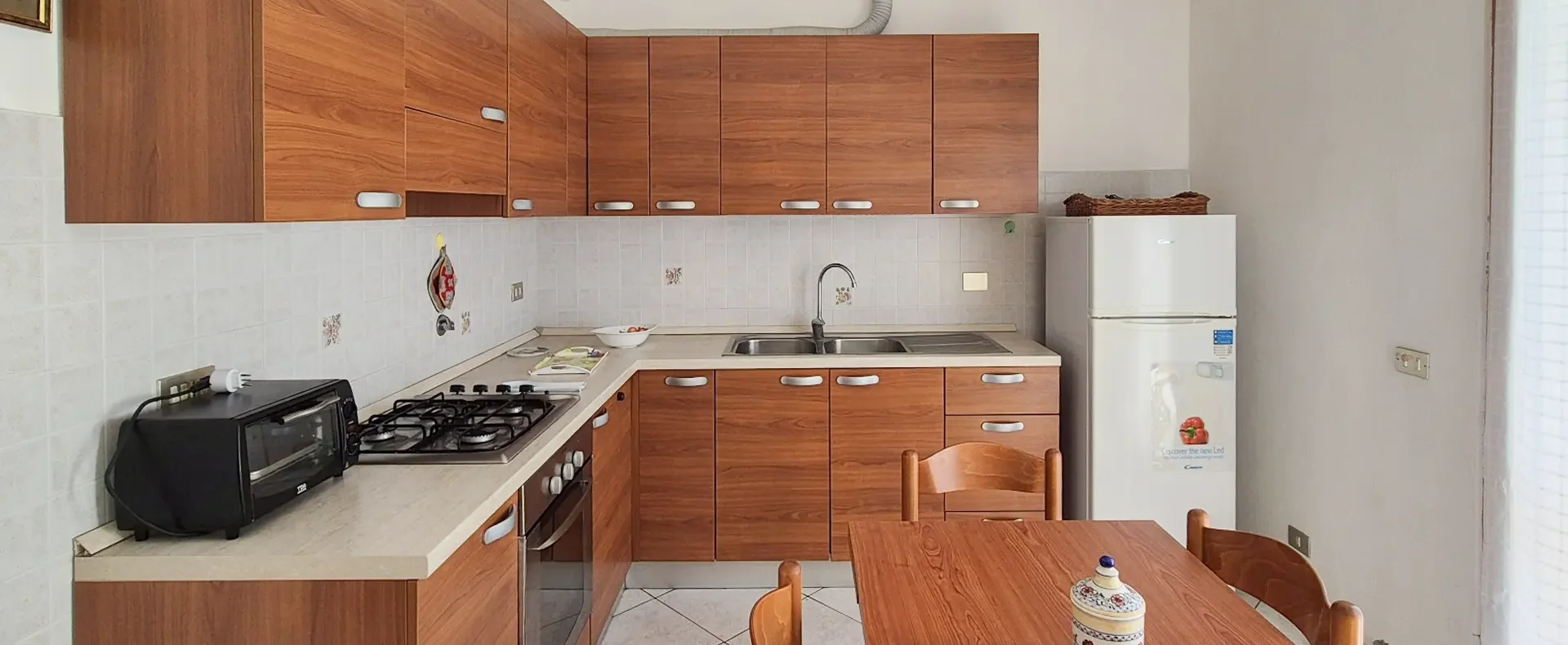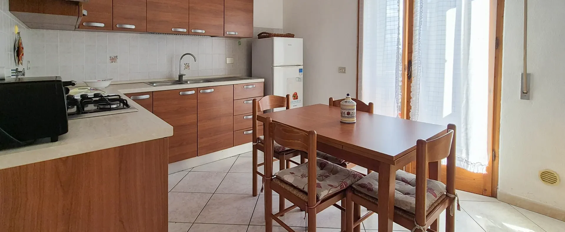 cucina abitabile, con divano, due camere matrimoniali di cui una con letto matrimoniale l’altra con due