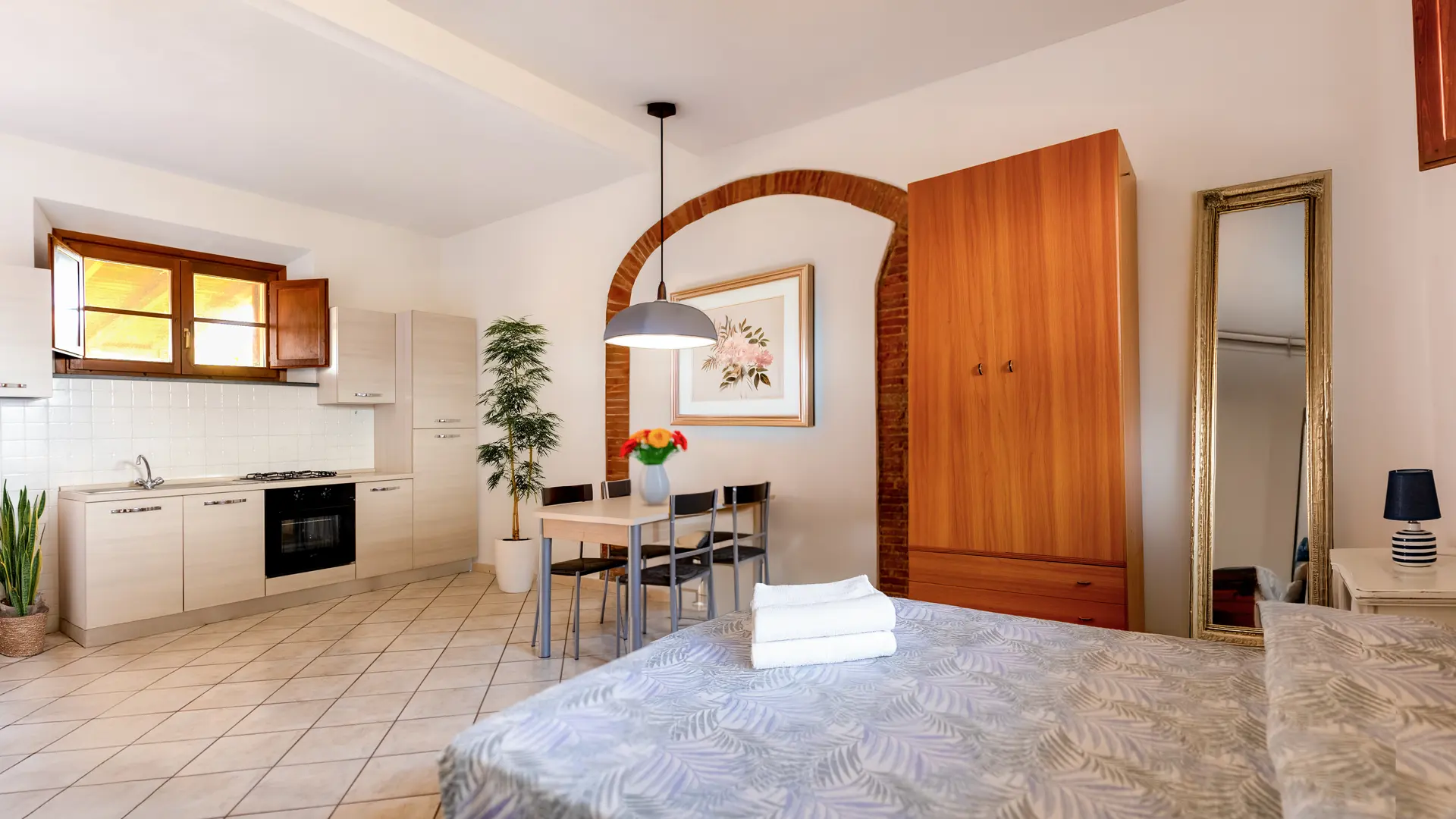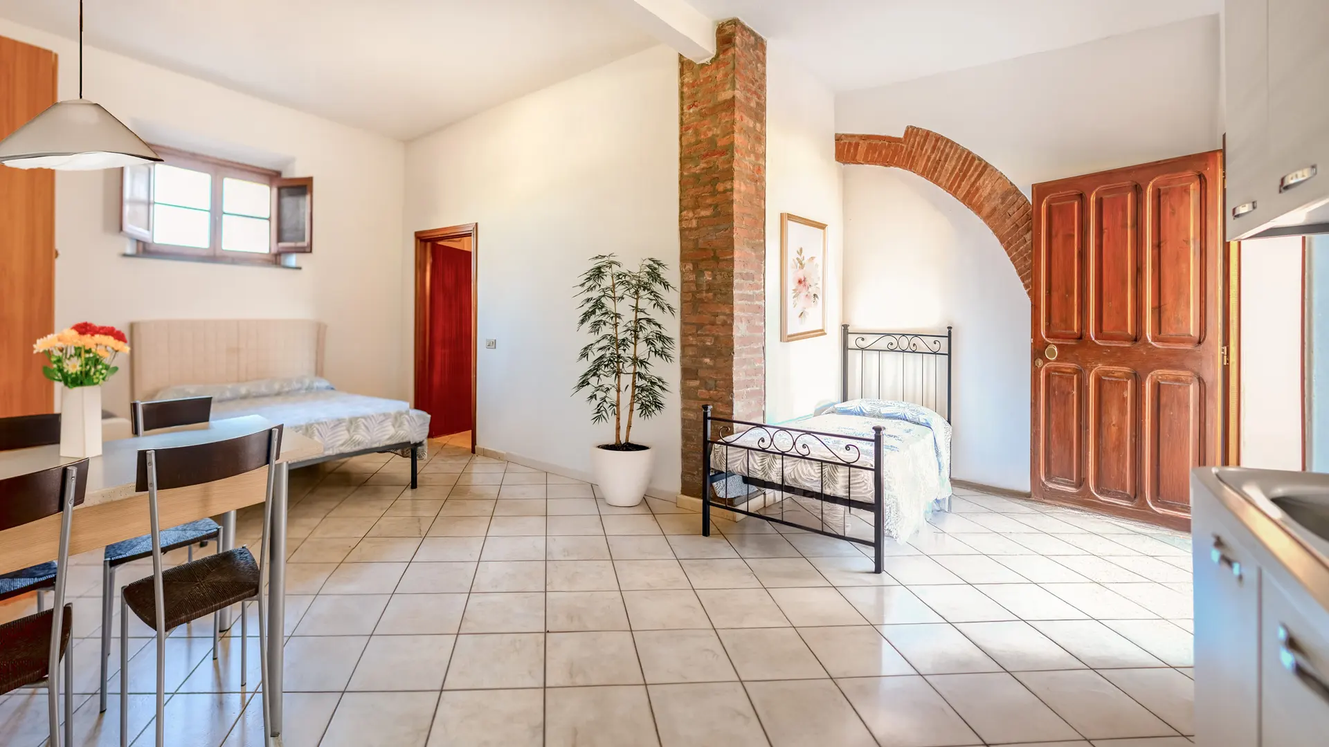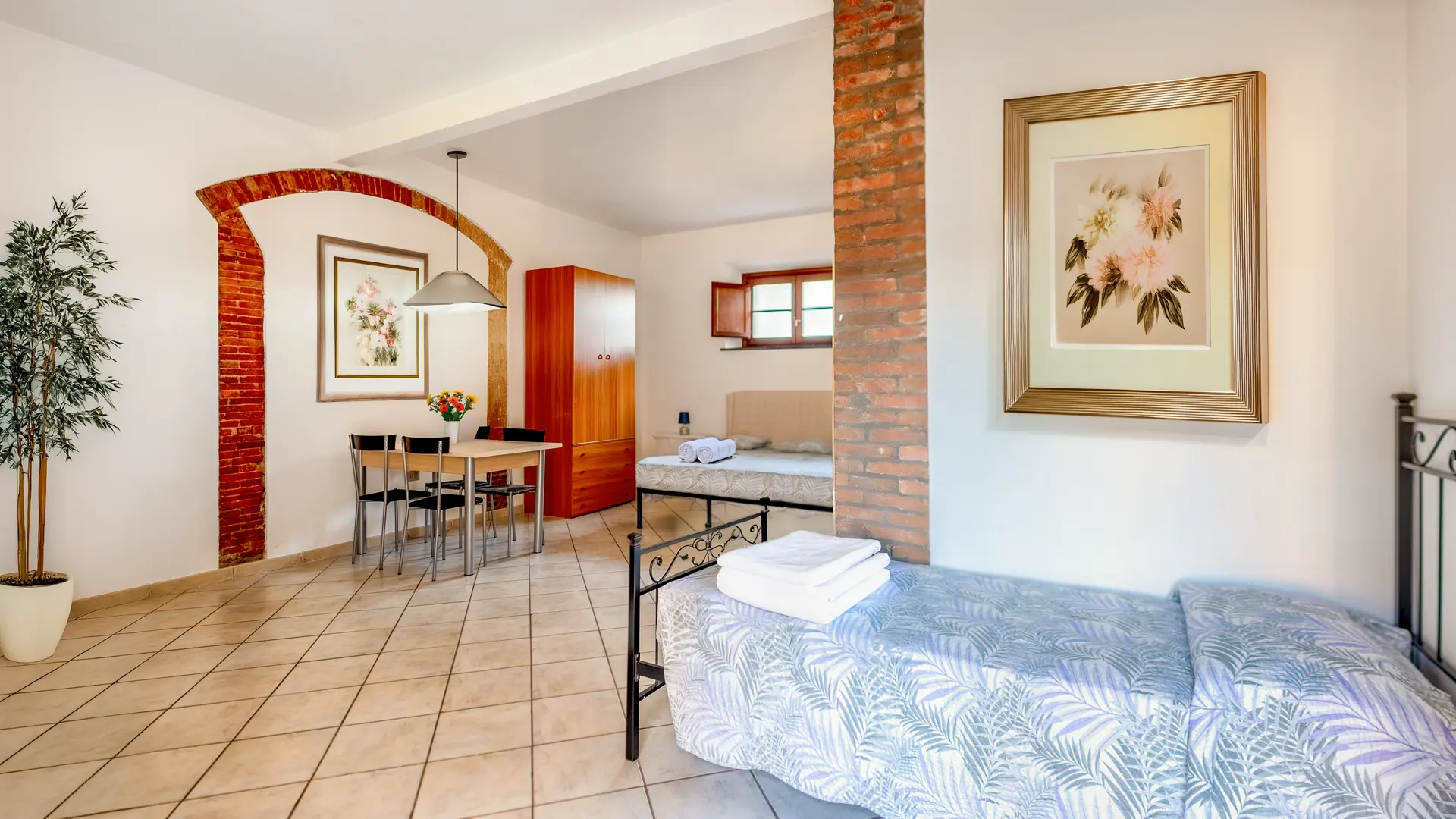 Scopri una soluzione abitativa immersa nel verde, perfetta per chi cerca tranquillità e comfort. Situato nella periferia sud di San Vincenzo, questo appartamento è posto al piano terra del fabbricato principale che include un angolo cottura, una zona pranzo, una spaziosa zona notte con letto matrimoniale e letto singolo un bagno con box doccia. Max 3 posti letto.